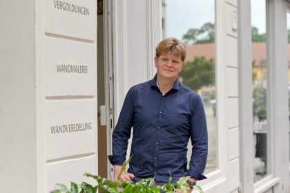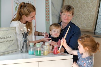 Im Atelier in der Grünstrasse 9 werden in Vorbereitung auf die Rekonstruktion bauzeitlicher Malereien Entwurfsarbeiten und Studien angefertigt.