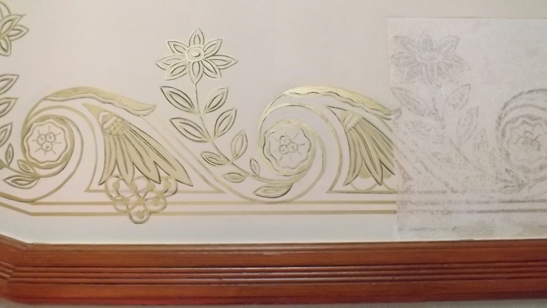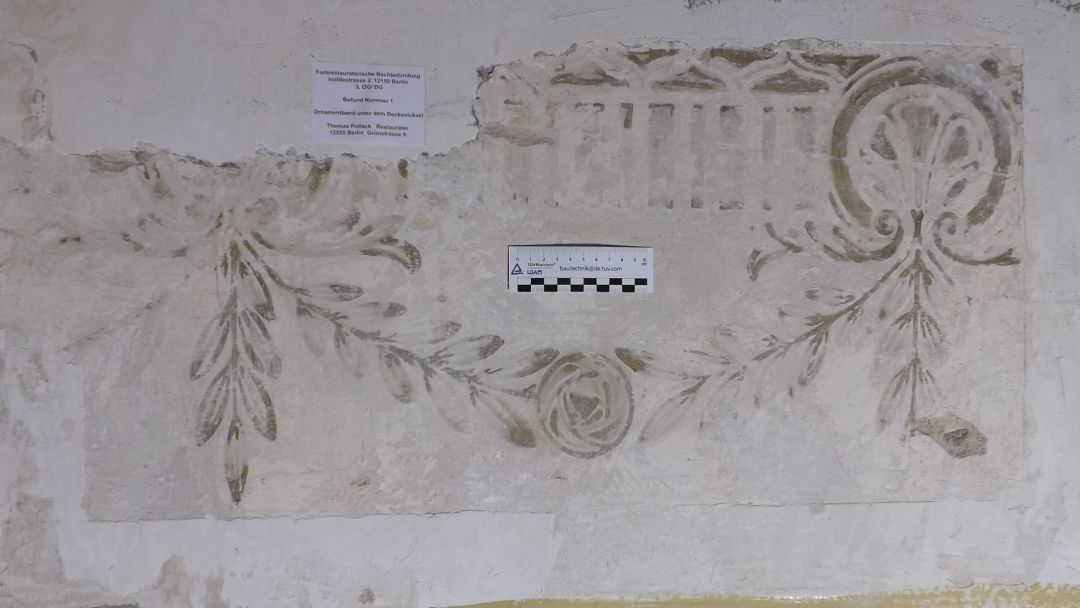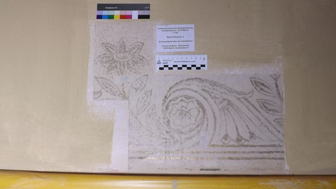 Befunderweiterungen für die Umsetzung der Rekonstruktion der bauzeitlichen Ausmalung im Wohn- und Geschäftshaushaus Isoldestrasse 2 in Berlin Friedenau.