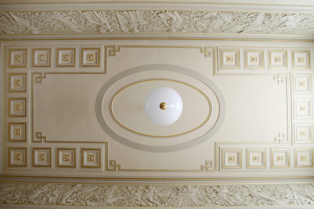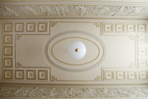 Ansicht der Deckenfläche nach Rekonstruktion der bauzeitlichen Fassung Datils der Kassettierungen wurden mit Blattgold belegt