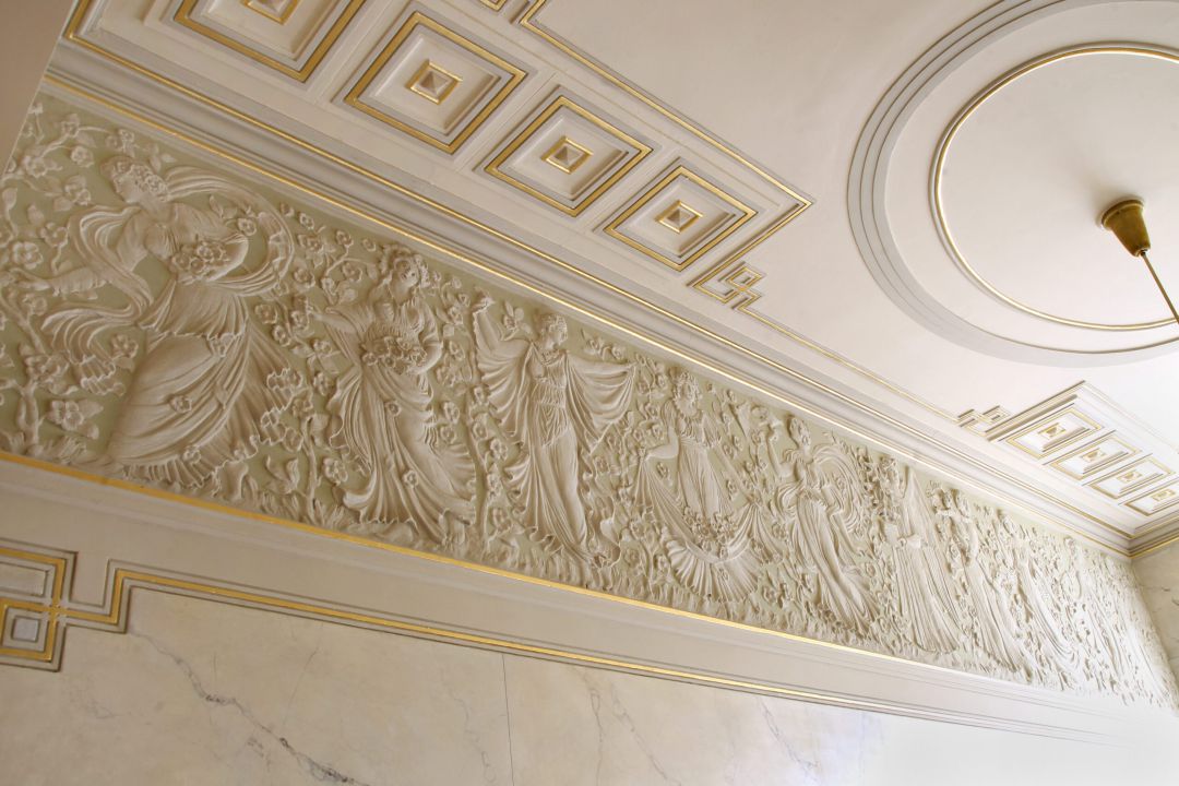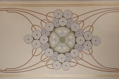 Nach Abnahme der Überfassungen wurde der Wandfrieses entsprechend der bauzeitlichen Fassung rekonstruiert. Details der Kassttierungen wurden mit Blattgold belegt