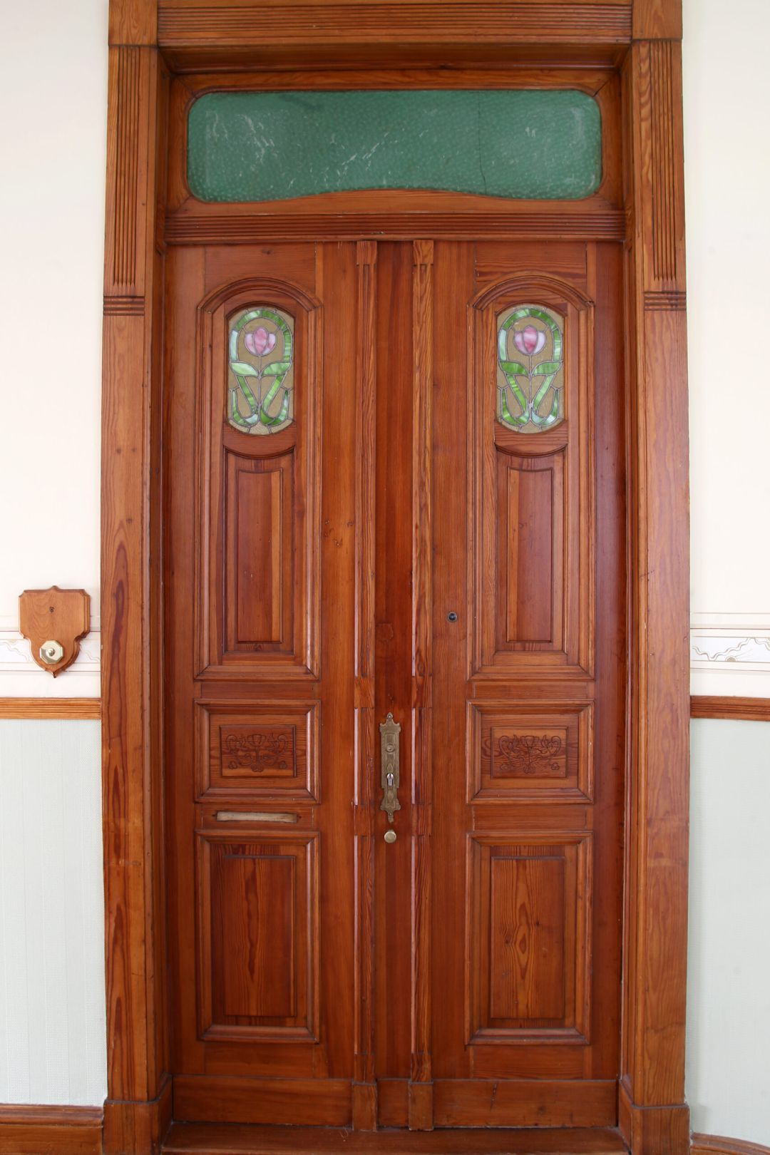 Nach Abnahme der Überfassungen wurden die Türflächen mit eingefärbtem Öl neu lasiert