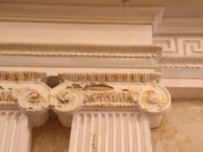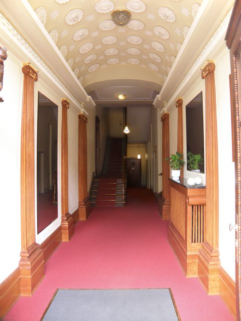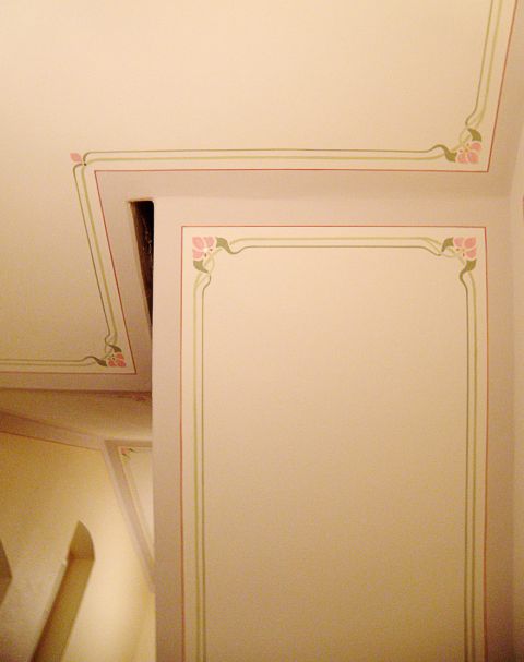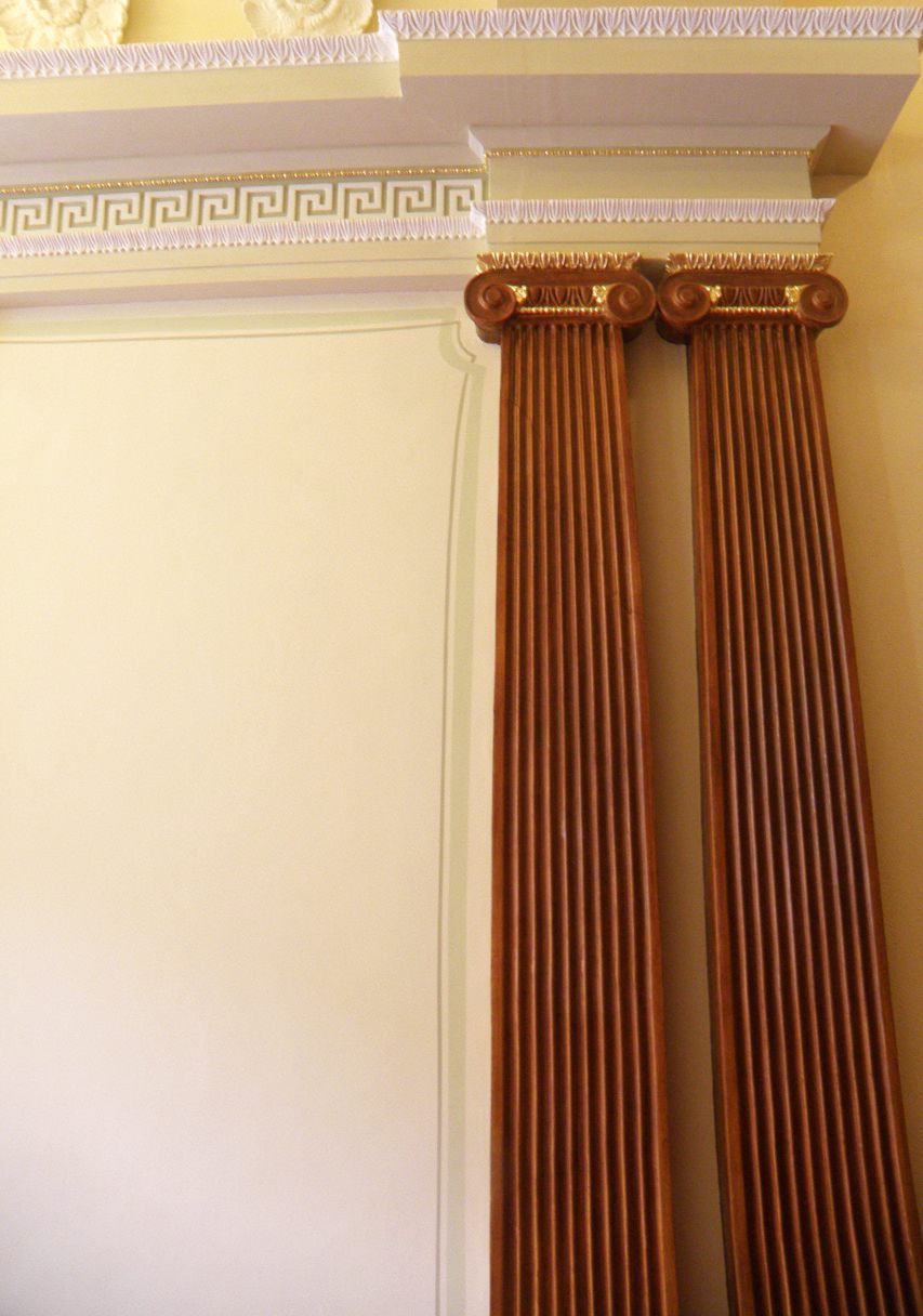 Entrée – Die Doppelpilaster wurden nach Originalbefund in Holzimitation gemalt. Von den Rosetten, Medaillons sowie den Kapitellen der Pilaster wurden die alten Farbschichten abgenommen, um die Konturen der Verzierungen wieder sichtbar zu machen. Die Felder zwischen den Pilastern sind mit Strichen und Bädern in Jugendstilmanier dekoriert.